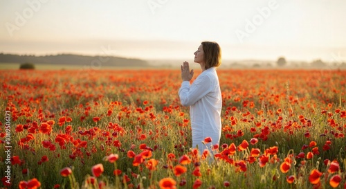 Tranquil meditation in blooming poppy field during golden hour for mindfulness and peace