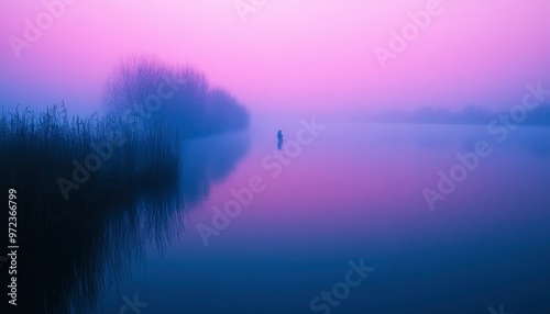 lake, water, sky, sunset, mist, fog, tree, silhouette, horizon, tranquil, calm, peaceful, serene, nature, landscape, purple, pink, blue, evening, dawn, dusk, mood, atmospheric, dreamy, soft, light, colours, gradient, still, surface, edge, calmness, quiet, natural, environment, beautiful