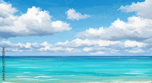 ocean, painting, water, cloud, sky, floating, day, horizon, clear, turquoise, sea, landscape, calm, brushstroke, artistic, cumulus, open, texture, coast, seascape, artwork, scene, nature, summer, vacation, weather, painterly, marin, bright, light, idylli, horizontal, art, background, travel, peaceful, graphic, design, illustration