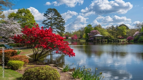 duck pond, lake, gazebo, azalea, tree, sky, blue, cloud, green, red, flower, water, spring, nature, landscape, tranquil, serene, beautiful, park, garden, grass, leaf, branch, sunny, bright, lush, vibrant, peaceful, calm, relaxing, scenery, view, idylli
