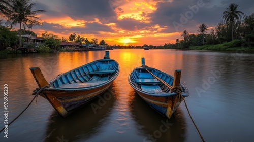 sunset, dusk, river, water, boat, wooden, traditional, travel, transportation, siam, asia, southeast, asian, palm, tree, sky, scenic, colourful, vibrant, beautiful, orange, yellow, blue, purple, nobody, serene, calm, peace, nature, culture, authentic, exotic, destination, adventure