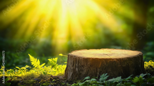 Tranquil Tree Stump in Sunlight Surrounded by Ferns and Vibrant Greenery in Serene Forest Setting
