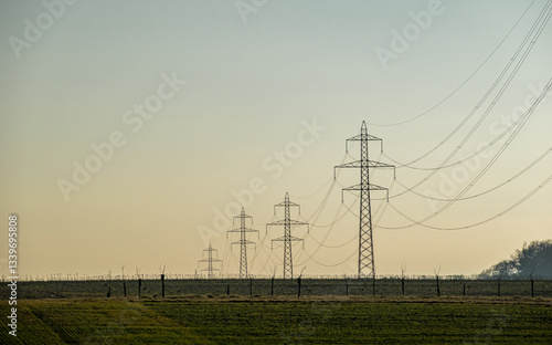 power, line, transmission, tower, electricity, structure, rural, dusk, landscape, silhouette, energy, grid, field, countryside, network, infrastructure, sky, utility, cable, technology, environment, connection, industry, horizon, pole, metal, system, pylon, wire, sunset, evening, outdoors, nature, farmland, engineering, voltage, support, plant, terrain, peaceful, quiet, cross