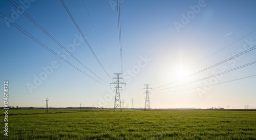 electricity, power, line, tower, transmission, energy, field, green, grass, sky, blue, horizon, landscape, countryside, sun, sunlight, bright, daytime, rural, infrastructure, utility, distribution, grid, pylon, support, construction, metal, steel, wire, electrical, supply, voltage, technology, engineering, nature, background, environment, clear, open, scenic, huge, stretch, expanse, vista, wide, perspective, distance, far