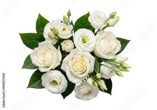 transparent roses and eustoma with fresh, gently unfolding petals, accented by dark green leaves, shot at 45-degree overhead angle against a smooth transparent. concept of purity and refined