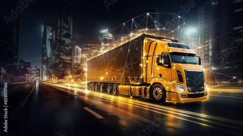 Transportation and logistics technology. Global business logistics import export and container cargo truck on highway, transportation industry concept.