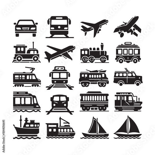 aeroplane, illustration, train, collection, ship, vector, transportation, icon, car, sailboat, white, design, bus, background