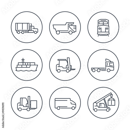 Transportation line icons in circles, Forklift, Cargo ship, Freight train, Cargo truck, vector illustration