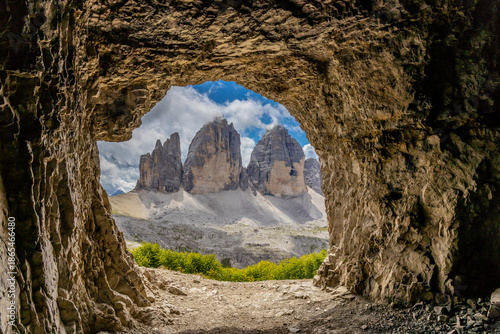 Tre Cime di Lavaredo (Drei Zinnen) in the Dolomites with three distinctive jagged peaks rising above alpine terrain. Mountain landscape showing rocky formations, high altitude environment, hiking
