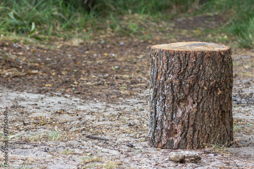 Tree stump. Deforestation. The rest of the tree. Threat to the environment. Sawed wood. Forest rejuvenation. Environment protection. Tree bark texture. Forest life. Ecologically clean area.