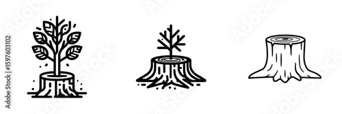 Tree stump illustrations with leaves and growth stages in black line art