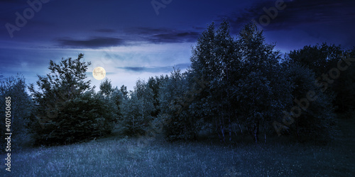 trees on the hill in summer scenery at night. beautiful mountain landscape in full moon light