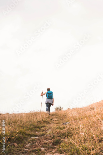 Trekking woman climbing hill on pathway