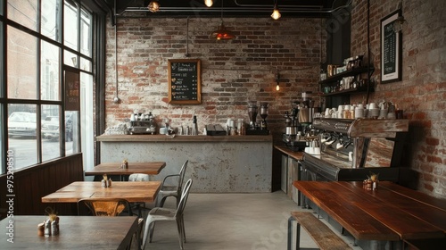 Trendy coffee shop interior with rustic wooden tables, exposed brick walls, and industrial decor