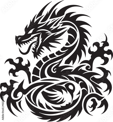 dragon, tribal, tattoo, design, fantasy, mythical, fire, scale, fierce, black, silhouette, art, illustration, creature, wing, claw, sharp, bold, warrior, power, strength, beast, flames, snake, eastern, western, symbol, vector, aggressive, tattooed, artwork