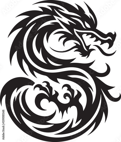 dragon, tattoo, tribal, vector, mythical, beast, fantasy, black, ink, fire, chinese, creature, fierce, power, monster, symbol, abstract, bold, oriental, curve, brute, danger, flames, tail, art, design, pattern, traditional, culture, stylised, graphic, outline, drawing, wild, decorative, animal, horn, magic, scale, aggressive, tattooed, print, clip art, element