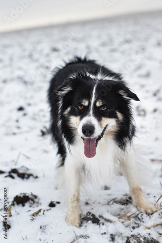 Tricolor border collie is going on the field in the snow. He is so fluffy dog.