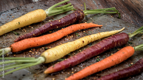 carrot, coloured, harvest, midwest, rustic, root, vegetable, orange, purple, yellow, healthy, baking sheet, roasting, raw, food, many-coloured, isolated