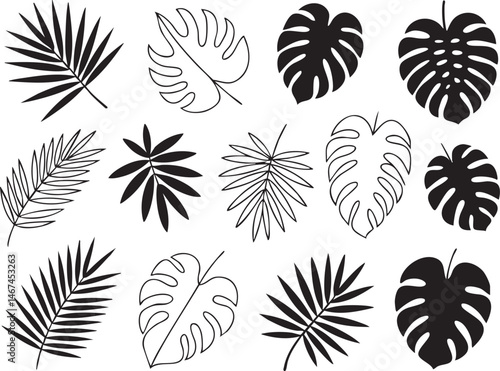 Tropical and exotic plant leaves in silhouette and line art style for botanical illustrations, nature-inspired design, jungle themes, eco branding, fabric prints, wall art, and organic packaging