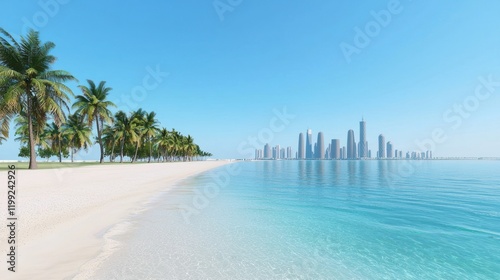 beach, city, skyline, ocean, palm tree, sand, tropical, summer, vacation, travel, seacoast, coast, horizon, water, sun, sky, blue, clear, bright, day, landscape, scenery, view, urban, modern, building, tower, architecture, resort, paradise, idylli, relaxing, calm, serene, peaceful, tranquil, exotic, tropical beach, city landscape, holiday, get-away, destination, tour tourism, travel destination