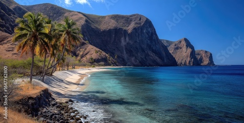 beach, ocean, coast, cliff, palm, tree, tropical, mountain, landscape, sunny, blue, water, white, sand, rock, shore, wave, sky, cloud, scenic, calm, turquoise, high-coloured, colours, lush, green, nature, outdoors, vacation, travel, serenity, paradise, exotic, beautiful, pristine, tranquil, dramatic, coastline, island, seascape, fiji, baja, coastal, view, holiday, summer, relaxing
