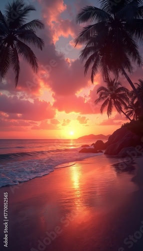 Tropical beach sunset shows vibrant orange, pink, purple sky. Palm trees silhouette against colorful clouds. Ocean waves gently reach sandy shore, reflecting golden sun. Serene evening landscape for