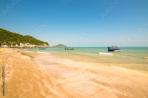 Tropical beach with sand shore and clear turquoise blue water and clear sky with colourfully decorated traditional Thai boats on shoal. Kui Buri, Leam Sala, Thailand