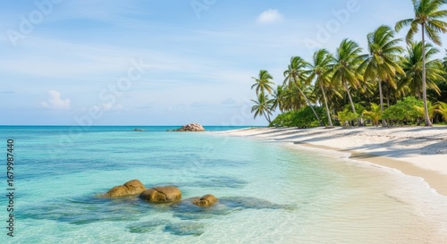 beach, tropical, ocean, turquoise, water, sand, white, palm, tree, coast, island, tranquil, calm, serenity, summer, vacation, travel, paradise, relaxation, beautiful, scenic, sunny, sky, blue, clear, nature, exotic, lush, calmness, pristine, calmness, idylli, coastal, rock, shore, view, seacoast, wave, gentle, empty, gold, light, warm, sun, bright, holiday