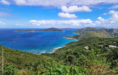 Tropical Caribbean landscape with lush green hills and blue ocean views