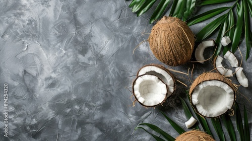 Tropical Coconut and Leaf Still Life on Grey Background Top View with Space
