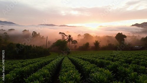 Tropical Coffee Plantation, Sunrise Coffee Fields, Vibrant Coffee Landscape, Rustic Coffee Huts.jpeg