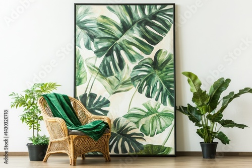 tropical, plant, leaf, chair, wicker, art, wall, decor, home, green, interior, design, living, room, cosy, comfy, nature, aesthetic, relaxation, style, modern, trendy, botanical, painting, framed, canvas, lush, vibrant, fresh, pattern, texture, furniture, potted, space, minimalist, elegant, natural, comfortable, seating, greenery, artistic, calming, high-coloured, exotic, leafy
