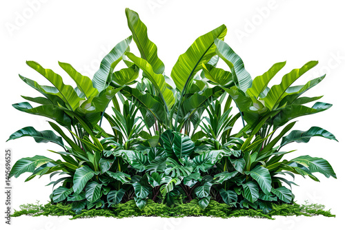 Tropical foliage arrangement with verdant leaves, showcasing lush green plants set against a transparent background
