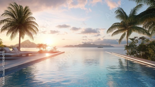 Tropical paradise retreat infinity pool view at sunset, serene vacation