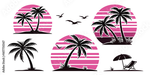 tropical, island, palm tree, sunset, beach, vector, graphic, illustration, summer, vacation, silhouette, design, sun, retro, pink, black, travel, holiday, paradise, coastline, nature, bird, relaxation, umbrella, easy-chair, scene, element, artwork, isolated, get-away