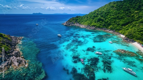 Tropical seascape of Similan Islands, with vibrant coral reefs beneath the surface.