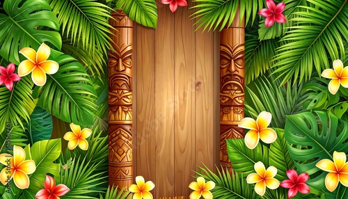 tiki, tropical, wooden, background, flower, leaf, plant, carved, pole, frame, border, design, illustration, summer, vacation, paradise, exotic, lush, green, floral, pattern