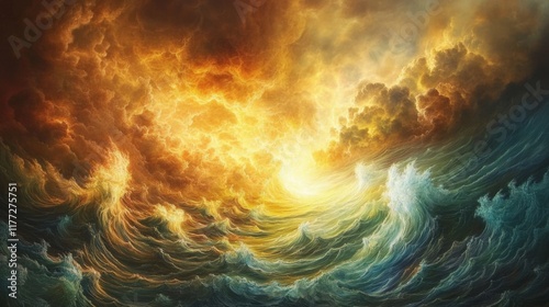 sea, ocean, wave, storm, sky, cloud, dramatic, turbulent, water, nature, weather, light, gold, dark, blue, orange, yellow, painting, art, abstract, powerful, energy, motion, movement, heavenly, force, landscape