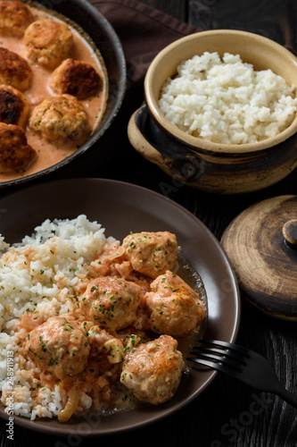 Turkey meatballs in tomato sauce with mascarpone served with boiled rice.