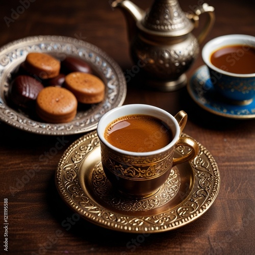 Turkish Coffee in the Colorful Ramadan Eid Candy and Chocolate, Traditional Ottoman Cuisine Desserts Photo, Üsküdar Istanbul, TurkiyeGenerative AI.