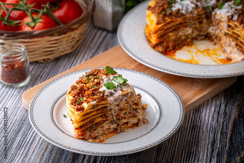 Turkish Food Kayseri Yaglama with Minced Meat, Yogurt and Tomato Paste