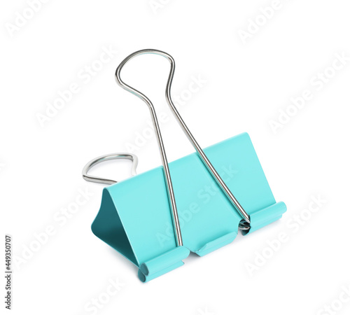 Turquoise binder clip isolated on white. Stationery