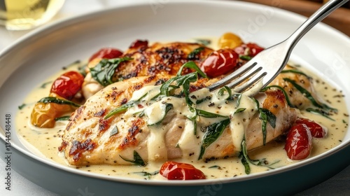 Tuscan chicken creamy concept. A delicious plate of grilled chicken with creamy sauce, garnished with cherry tomatoes and fresh herbs, served in an elegant dish.