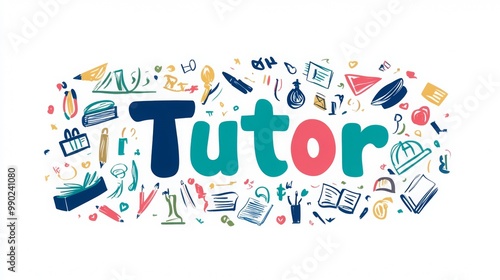 "Tutor" word isolated on white background with icons representing education.