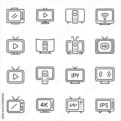 TV icons pack featuring 4K, HD, smart TVs, remotes, and play symbols, perfect for media and entertainment projects