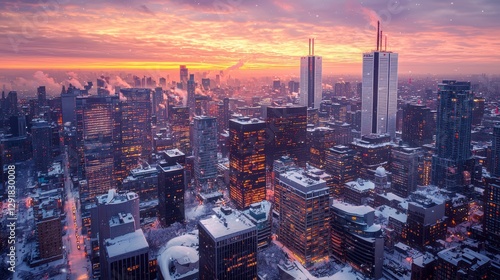 snow, sunset, winter, city skyline, urban, golden light, snow-covered, peaceful, cold, serene, breathtaking, sky, reflections, tranquil, evening, picturesque, seasonal, panoramic, beautiful, glowing, frost, solitude, vibrant, scenic, dramatic, architecture