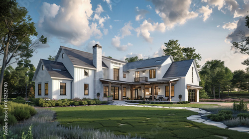 Twilight unveils the stunning modern farmhouse luxury home exterior, blending sophistication with natural beauty. --ar 16:9 --v 6.0 - Image #1 @Zubi
