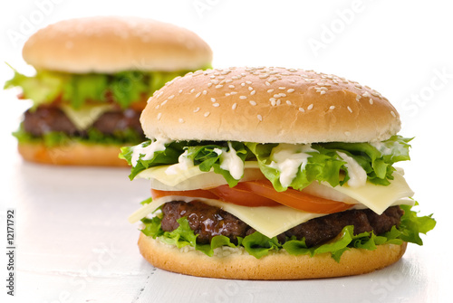 burger, large, 2, hamburger, american, cheese, white background, bun, sesame, seed, lettuce, tomatoes, onion, mayo, mayo, relish, pickle, bread, fast food, food, take away, take-away, meal, fats, unhealthy, sauce, grande, slice, slice, sliced, table, white, pair, dinner, eatery