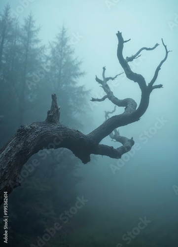 Twisted Tree Branch in Foggy Forest: Spooky and Atmospheric Scene