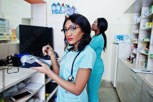 Two african american pharmacist working in drugstore at hospital pharmacy. African healthcare. Work with payment terminal and credit card.